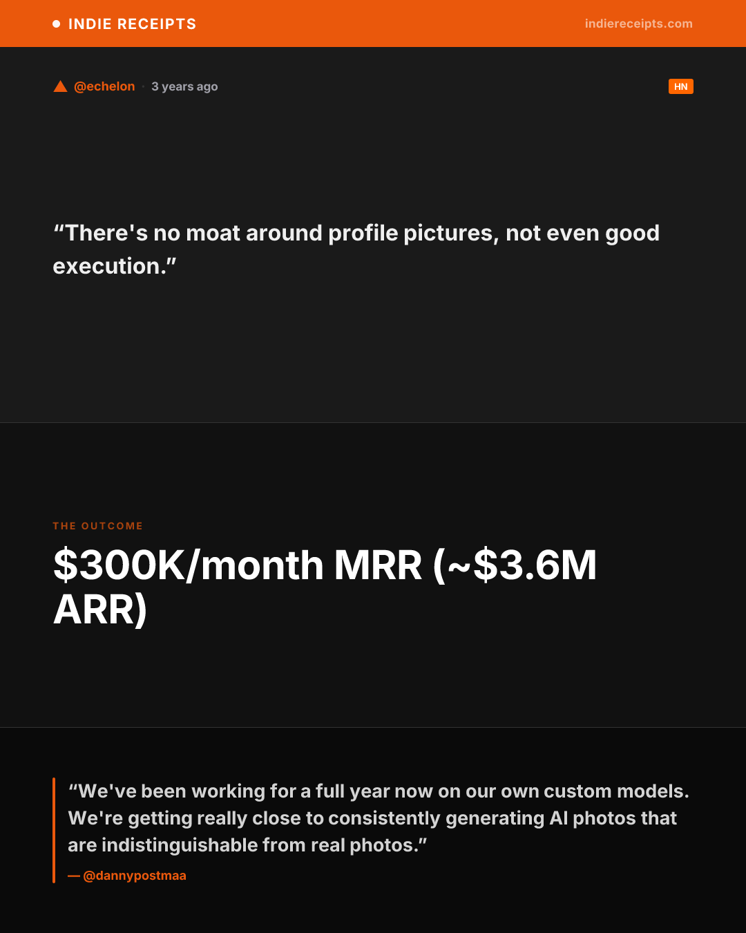 Danny Postma launched ProfilePicture.ai in 30 hours post-Stable Diffusion, watched it explode then fade. Users kept asking for professional headshots specifically. He narrowed the focus, launched HeadshotPro in March 2023, and hit $100K ARR in 14 days.
