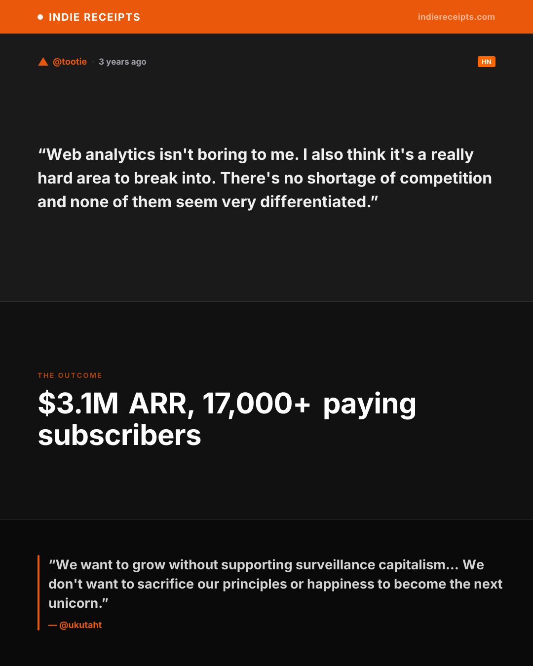 “Web analytics is boring. Cron job monitoring is boring...These businesses...are all doing great, making millions.”