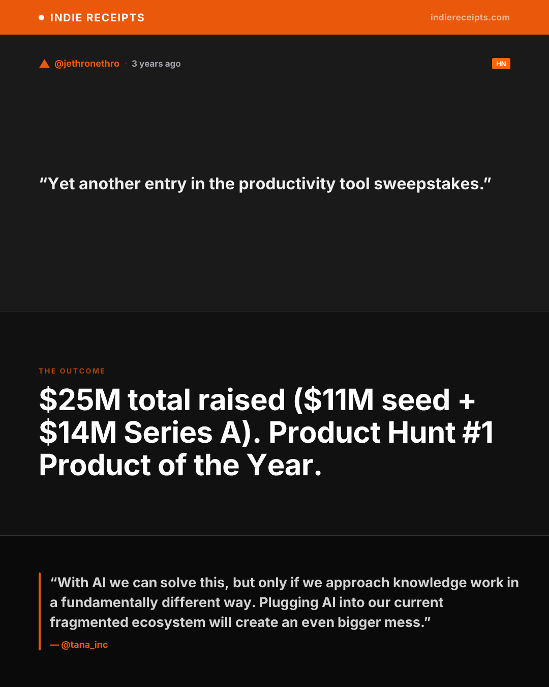 press HN mentions Tana for the first time. Dismissed as 'yet another productivity tool.'