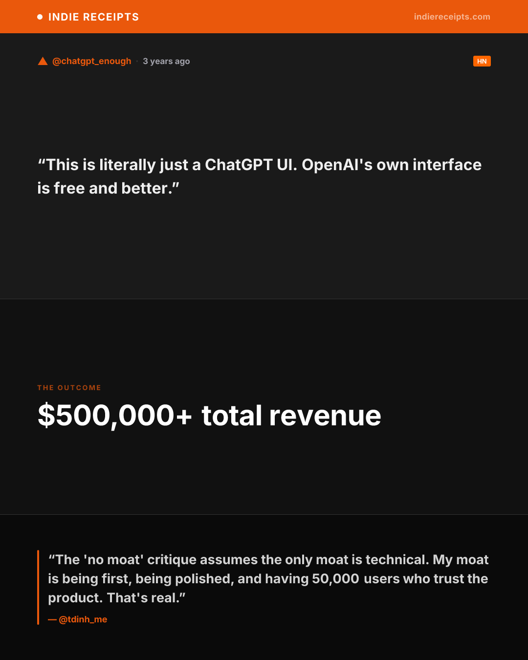 “The 'no moat' critique assumes the only moat is technical. My moat is being first, being polished, and having 50,000 users who trust the product. That's real.”